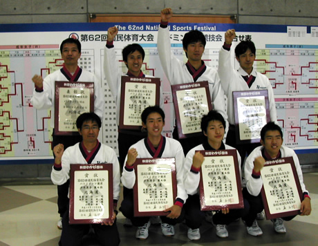 ![]() 入賞した、【 成年男子 】 【 少年男子 】 の皆さん ![]() 【 成年男子 】 左から、松村監督 ・橋村選手 ・多田選手 ・竹村選手 ![]() 【 少年男子 】 左から、井口監督 ・小野寺選手 ・田渕選手 ・鈴木選手 ![]() 【 成年女子 】 左から、村山選手 ・永野選手 ・竹内選手 ![]() 【 少年女子 】 左から、小野地選手 ・佐藤選手 ・小久保選手