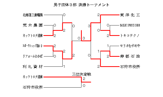 男子団体3部 Bブロック | スポーツショップ尾山A | 荒木農園 | 石狩市役所 | 順位 |