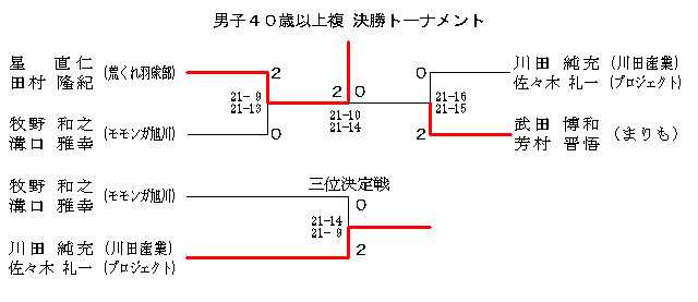 | 男子40歳以上複 Aブロック | 川田 佐々木 | 星 田村 | 菊地 田中 | 順位 |